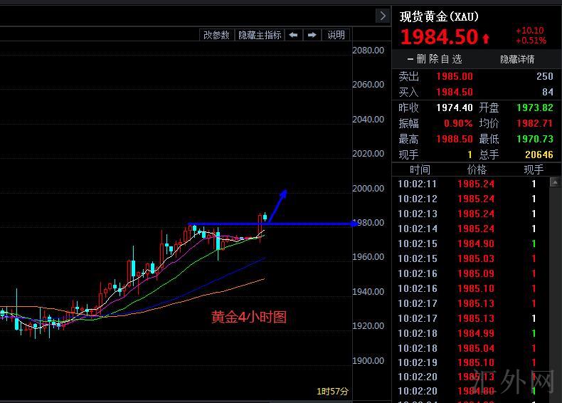 黄金亚盘大阳击穿,4小时均线体系买方排列开始发散,亚盘黄金1984-80区域跑步进场多 止损 1977 计划1996---2005