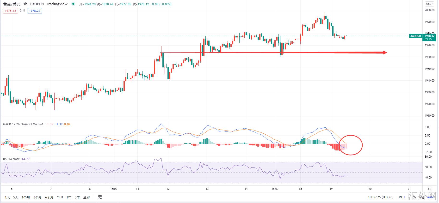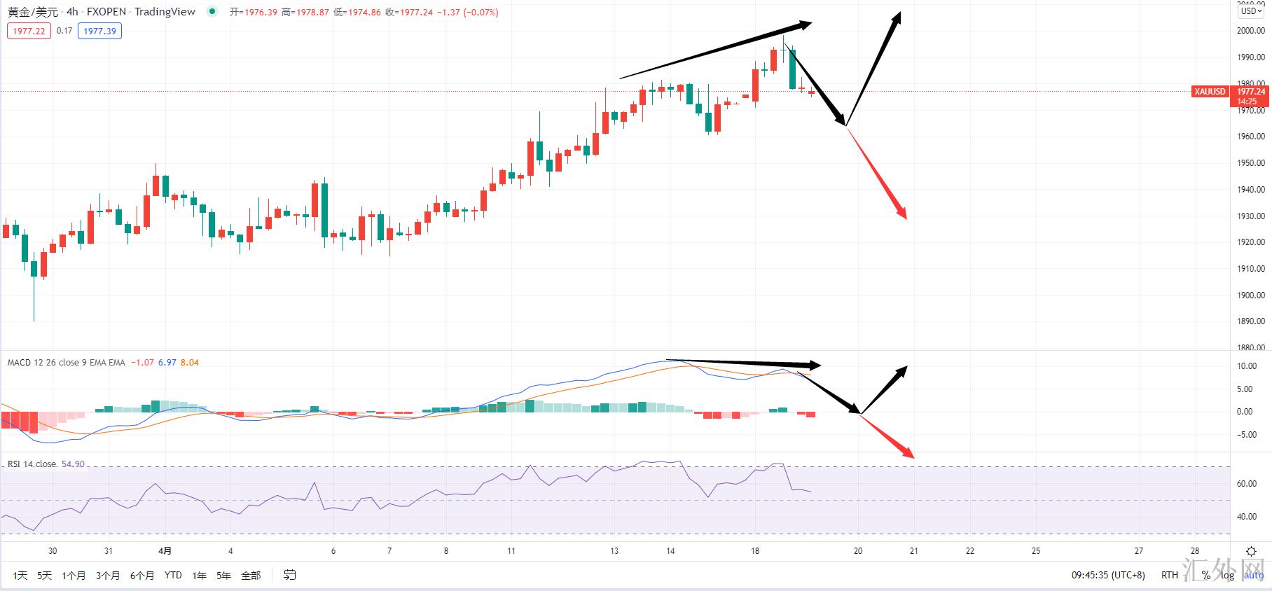 昨天给出的短线思路是看15分钟的震荡上涨,注意2000点一下,昨天白天的行情差不多符合预计,在15分钟接连震荡上涨迈出二次顶背离后面,行情最高刷新1998,到达高位后面,小时级别的MACD快慢线高点死叉,黄金进入到1小时级别的修正值中,1小时的修正动员4小时迈出了反转,4小时顶背离也成立了,但是日K线快慢线在0轴上方金叉后面往上发散的程度还不错,所以4小时级别或许会走多次顶背离,假使显现如此的情形,那么黄金就是震荡上涨,假使4小时级别在顶背离后面快慢线直接下0轴,那么日K线快慢线大约率会从新死叉,但是也没形成日K线顶背离,黄金大约率就是宽幅震荡。
