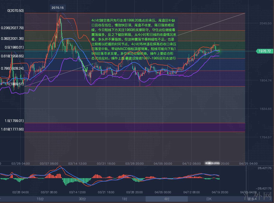 4小时跳空高开先驱上升1998.20高位后遇阻,收盘回补空缺且收在低点。慢涨快回踩,收盘不收回,隔日强劲难保持,今日短线以下注意1960的支持防守,守稳此位持续看震荡看多,反之朝下击穿则走弱,从4小时和日K线的收盘情形来说,买方并没有算强劲。但该种震荡节奏连续性不足,也是比较很难把握的时间节点,4小时布林道在探高后收口遇阻回调至中轨,动员MACD指标顶部背离。短线或许朝下轨1965回调谋求支撑。多空来回拉锯转换,操作上要结合形态灵活应付。操作上鑫.豪推荐环绕1987-1965区间去执行。