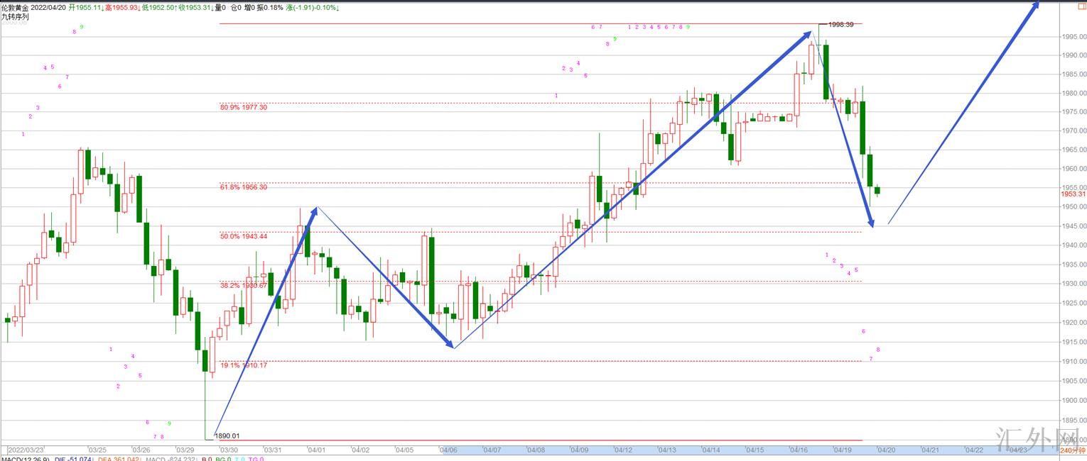 当前1945这里也是黄金接下去的最后一同防线,1945这里不仅是斐波那契50%位置,也是当前的一浪顶部位置。