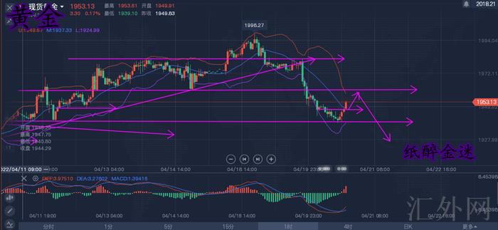 星期三(4月20号)亚欧时段,黄金现货震荡下挫,最多失1940关键点位,刷新逾一周新低到1939美元每盎司,在黄金价格上冲2000整数关键点位遇阻后,部分买方止盈出场退场,美国事实利率转正和美元的暴涨,给卖方反扑给予了机会,黄金价格短线仍有震荡调动的需求,注意55日移动均线1923左右支撑和逢低做多盘情形;基本分析层面,俄乌局势连续紧俏,或许会制约黄金价格的下挫空间。