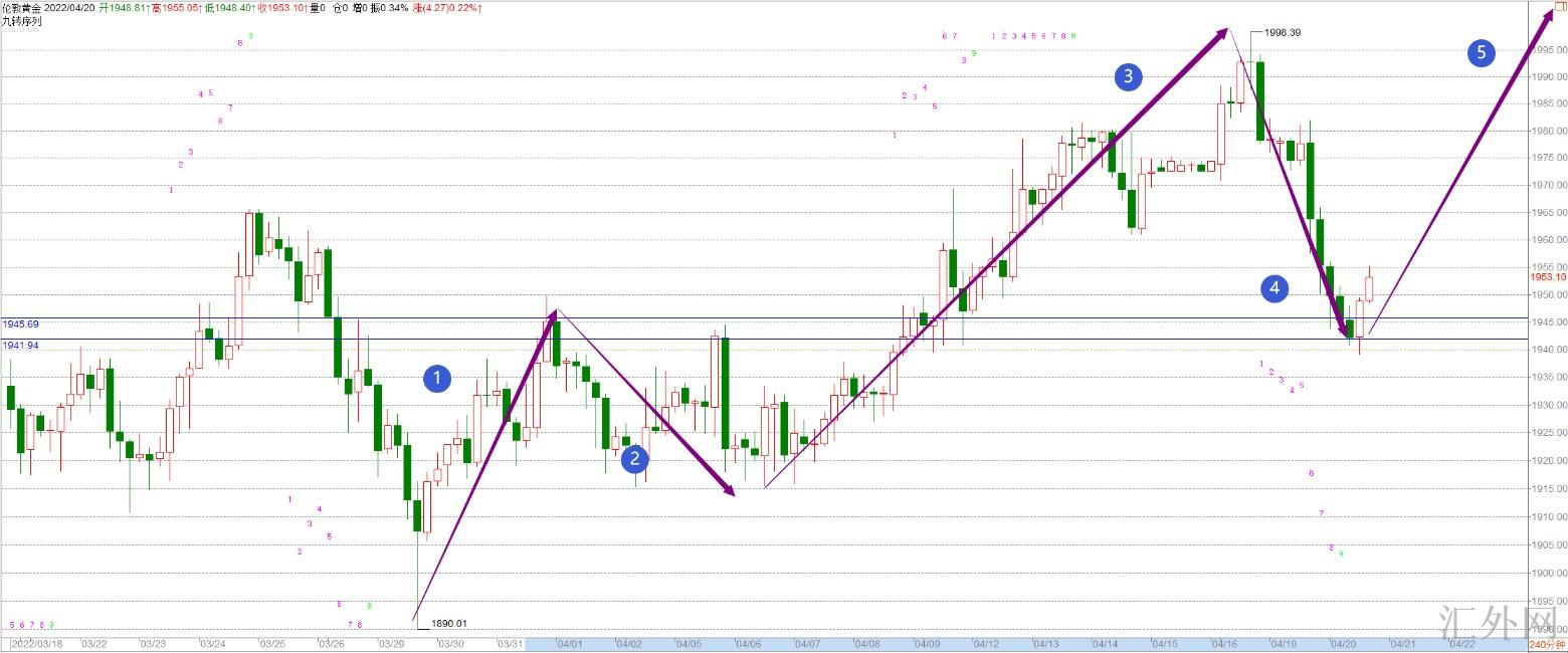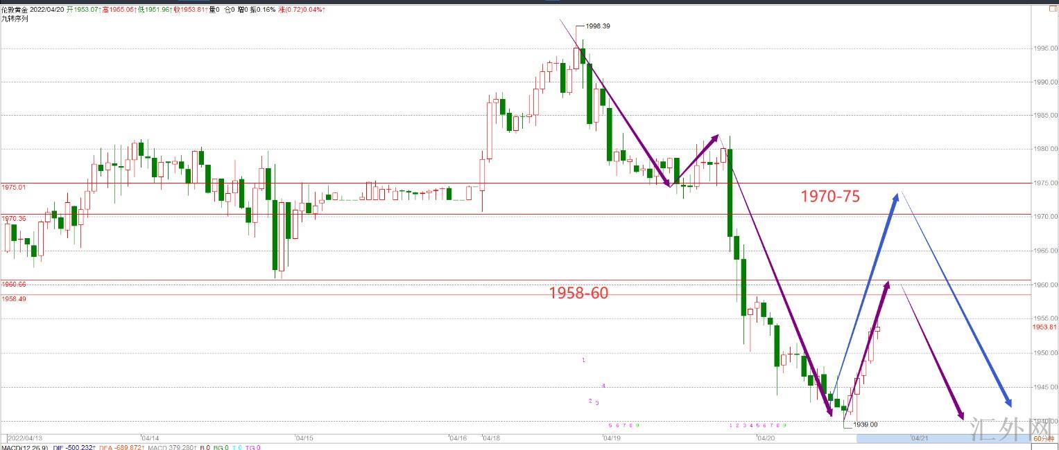 小时图这里当前从1940回弹这段趋势可以作为第四浪的回弹,那么只要这个浪形回弹完毕,接下去还会显现第五浪的下挫。