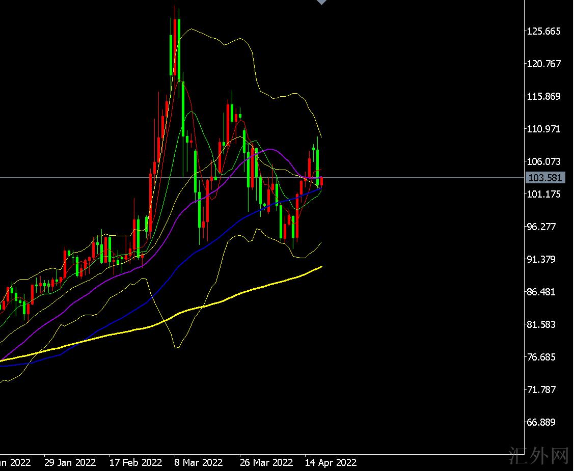4小时看,当前回弹120日移动均线103.5遇阻,上方压力看10日移动均线104.8左右,以下支撑看布林下缘101左右。