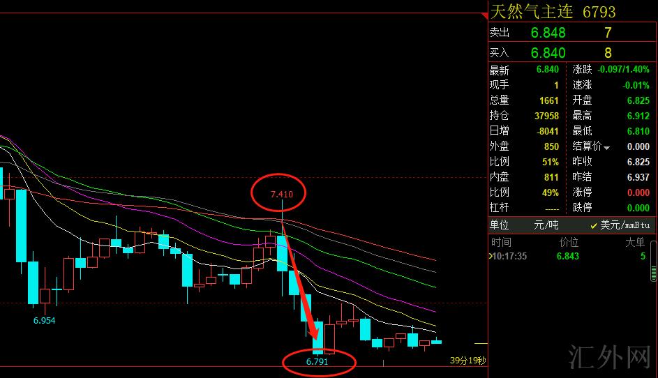 天然气昨日给出7.480空单最高回弹7.410名置,今日来说依旧看跌不变,回弹观察上方关键点位抑制。
