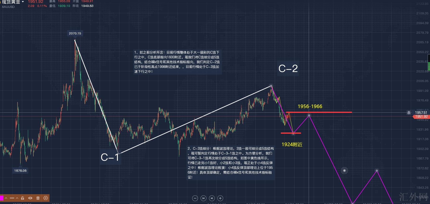 2、C-3浪细分:依据波浪理论,3浪一般可细分成5浪结构,现可暂判定行情处在C-3-1浪当中。为方便分析,我们可将C-3-1浪又一次细分成5浪结构,如图中黄色线所示,行情已走完小1浪、小2浪和小3浪,现正处在小4浪回弹当中!依据波浪理论推演:小4浪回弹顶部理论上位于1956左右!依据裸k形态和其余技术指标,当前可将1958看为阶段性顶部,故小4浪暂可判定终结,行情进入5浪下探当中,底部看1924-1930!