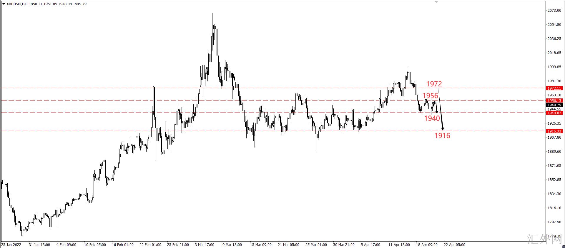 比如1972美元关键点位,我觉得此位置的转折点性很强,在我的体系中可以促成3—4重技术共振,所以此位置将作为小几率的交易预计。而今天我们的交易核心在于1956左右小止损交易空单,守稳前高1958便直接看到以下1940突破并抵达1932和1916!