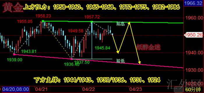 对于今日行情,短线上,以下推荐先注意1944/1943左右支撑,这里是昨天收盘自低位1937/1936左右上升1954的黄金分割0.618名置;其次推荐注意1937/1936低位位置支撑,昨天欧盘和美盘两次试探没有朝下击穿,今天持续关注;若行情持续走跌,推荐更深一步注意1931、1924左右支撑。