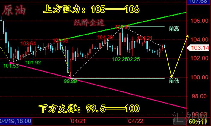 原油从技术分析来说,原油昨日短线走得反复,空间不算大,但拉锯的程度较大,最低102.20一带启稳,摸高105.42高位后再遇阻收在低点,日K线收盘小阳星K线,空间走得不大,拉锯的频率大,给人一种空间走得很大的错觉。日K线星K线整理局部钝化。今日周线收官之作,震荡收尾思路对待。4小时在此之前高点滑落后,昨日没能保持,反向收回104.00上一日高位,但收盘依旧不强劲,短线伴伴随阴阳转换的痕迹。K线结构阳吞阴再配合吐回收低,局部拉锯临时看不出单边方向。震荡行情中,点位为王,