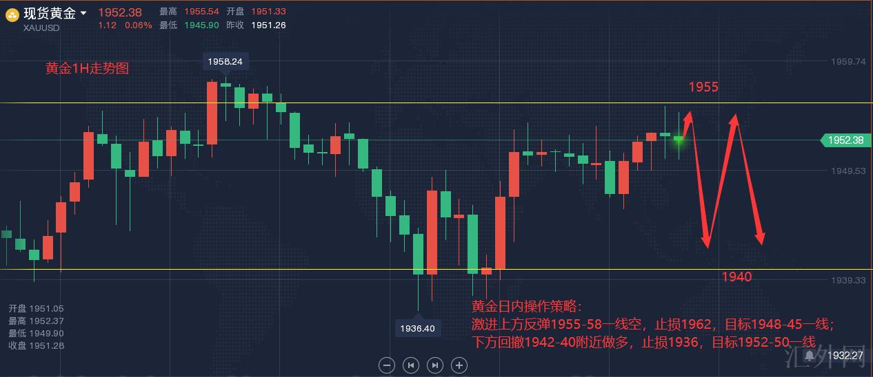 黄金日间操作策略:激进上方回弹1955-58一线空,止损1962,计划1948-45一线;