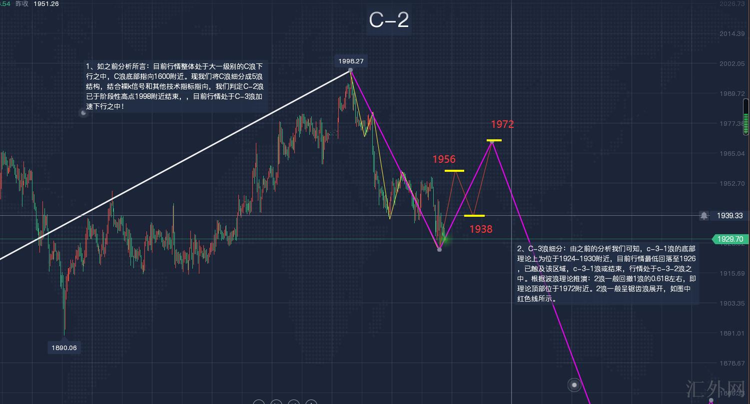 2、C-3浪细分:由以前的分析我们可知,c-3-1浪的底部理论上为位于1924-1930左右,当前行情最低回调到1926,已刷新该区域,c-3-1浪或终结,行情处在c-3-2浪当中。依据波浪理论推演:2浪一般回撤1浪的0.618附近,即理论顶部位于1972左右。2浪一般呈锯齿浪展开,如图中红色线所示。