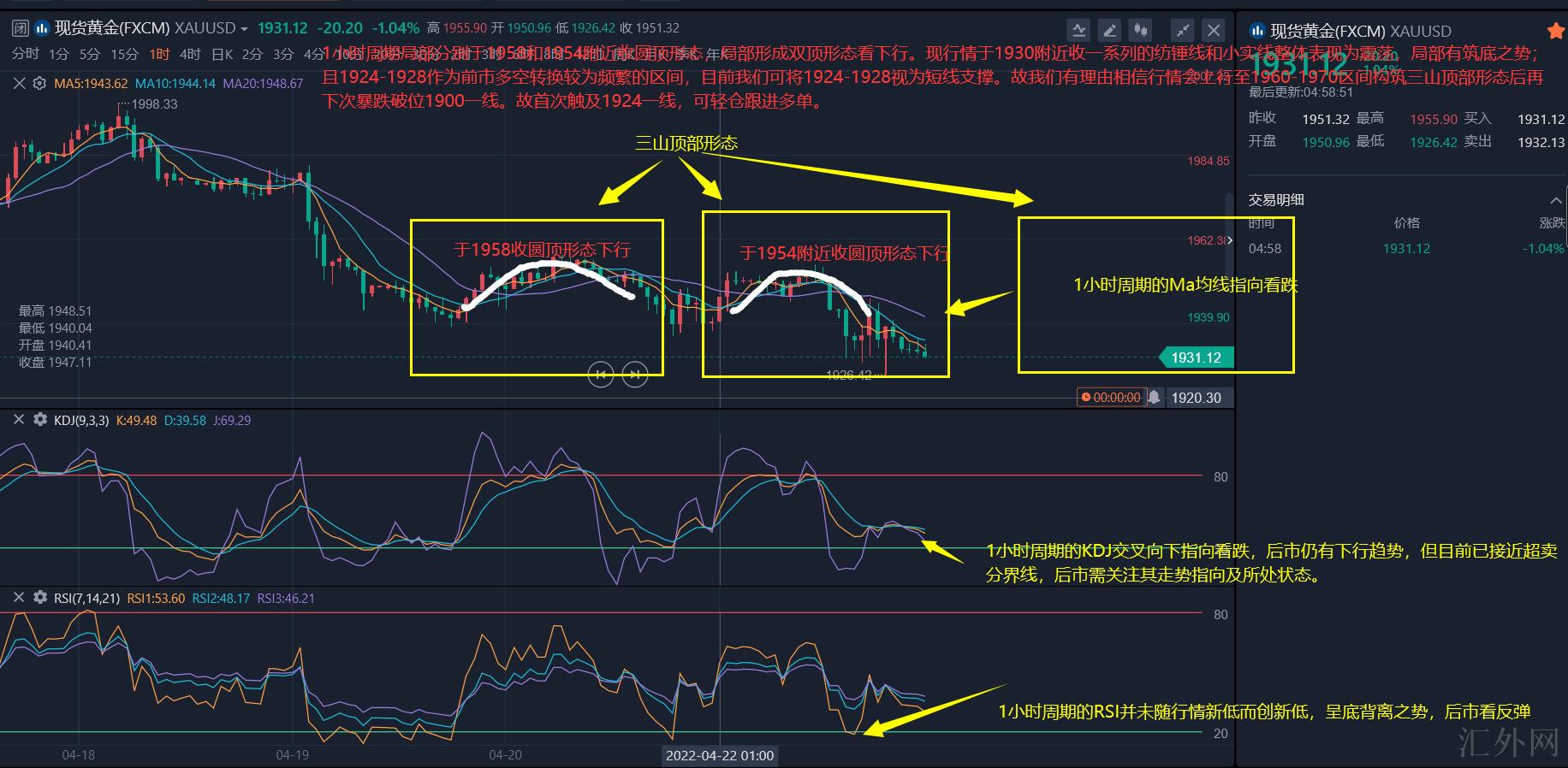 1小时周期:1小时周期分别于1958和1954左右收圆顶形态,局部形成双顶形态按计划下探突破1930一线。现局部于1930左右收一连串的纺锤线和小实线震荡筑底,由于1924-1928为前市多空转换较为频繁的区域,故当前仍可将1924-1928看为短线支撑区间。若下周立住于1924-1928区间,则后市大约率会构筑三山顶部形态,即行情会上涨到1960-1970左右后又一次下探突破1900一线!当前1小时周期的Ma均线指向看空;1小时周期和15分钟周期的KDJ交叉朝下指向看空,短线仍有下探趋势,但当前皆已靠近超卖分界线,后市需关注其行情指向及所处状态;1小时周期的RSI仍未随行新低而创新低,短线呈底背离之势,后市看回弹。【添加姜新华唯一型:jxh1592,获取实时分析和策略】