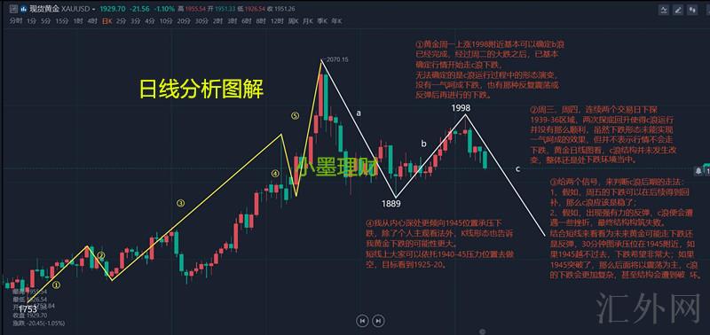 在星期三、星期四接连两个交易日下探1939-36区域,两次摸底回涨致使c浪运行并没有那么顺遂,尽管下挫形态未能达到一气呵成的效果,但并没有表明行情不会走下挫,黄金日K图看,c浪结构仍未发生更改,整体依旧处在下挫环境当中。
