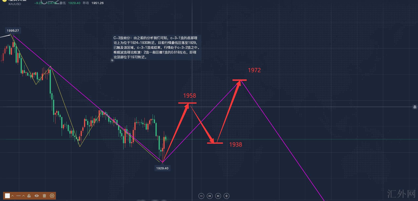2、C-3浪细分:由以前的分析我们可知,c-3-1浪的底部理论上为位于1924-1930左右,当前行情最低回调到1927左右,已刷新该区域,c-3-1浪或终结,行情处在c-3-2浪当中。依据波浪理论推演:2浪一般回撤1浪的0.618附近,即理论顶部位于1972左右。2浪一般呈锯齿浪展开,如图中红色箭头所示。
