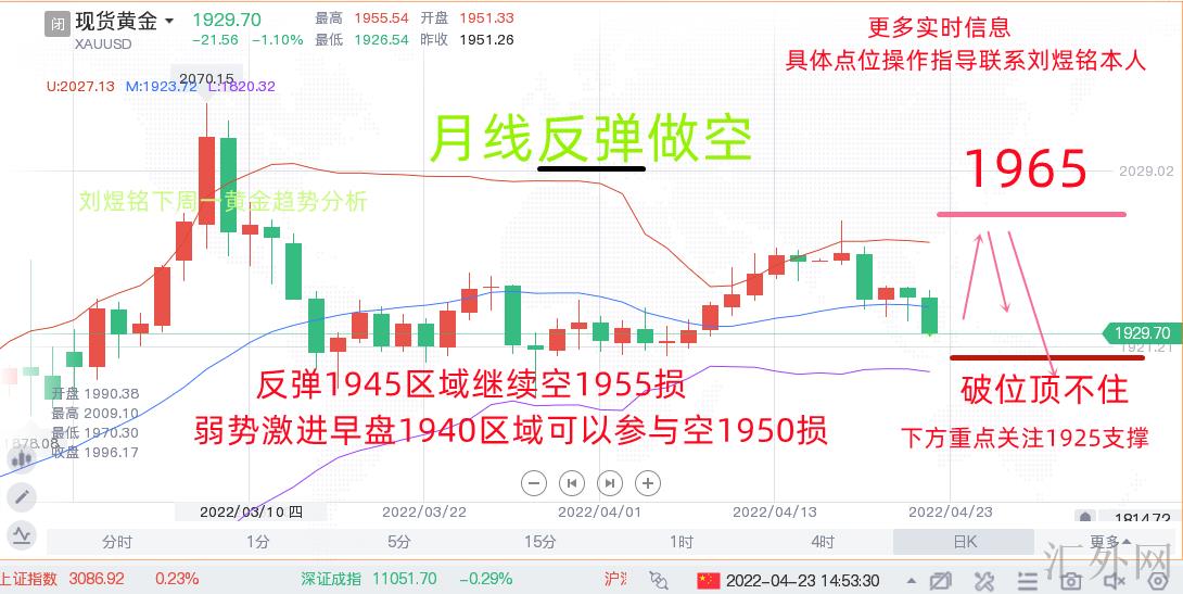 这周黄金完美符合预计从1998一路震荡下挫到1926区域,差不多70美金单周震荡下挫行情首先恭喜跟随一路买跌转到盆满钵满。这就是跟2070我们提示中线空一周闪崩170美金行情一样,此次多空转换又一次暴跌验证,消息作用震荡程度和强度不会更改趋势,乌克兰危机制裁避险近尾声对比美联储接连加息缩表依旧有好处空头占领上风,核心此次加息不止一次,在随后的6次议息会议随时加息50基点,这才是最大有好处空头,世界股指也是疯狂抛压,那么黄金自然也不例外,那么下周行情距离加息只有一周时间,这个时候买方盘中回弹修复冲顶回调均为主旋律,临时不能大幅回弹,毕竟加息缩表鞋子没有落地,跟3月加息行情一样,只有到加息落地看官员发言以后才可确定是否回弹,假使加息以后鹰派言论持续,那么6到7月加息时间窗口即将来临,黄金也是很难大幅回弹,同期5月9号俄罗斯国庆日针对乌克兰也是要有收官动作,略微乌克兰危机缓和或者积极协商,均为促进黄金闪崩行情。技术盘突破前期盘整整理1915到1940区域上缘,那么又一次挑战1910到1915区域行情只要突破1910差不多1800时代就是来了,所以这个时候宽幅震荡你千万不要追涨杀跌,一定控制多空节奏,昨日盈利不是今日炫耀筹码,把握今天才是王道,一定切记,当下世界中央银行开放加息减缩货币政策那么黄金就是震荡下挫主旋律,后面经济略微转好,乌克兰危机协商积极,和流行病有效控制黄金均为从哪里到达哪里去,就如这周1998一路主方向看跌,回弹阻力反复空瞬间均为利润嗨翻全网。不要等你账户爆仓,才知道怎么回事,只渡有缘人。综合上述交易参考如下: