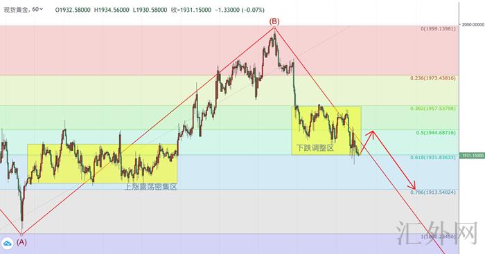 在上星期二黄金美盘出跳水行情我们追空后,也是给出了准确分析,B浪高位的显现,当下大趋势走C浪下挫。上星期五黄金收盘在1931(618的位置)星期一的行情预期是震荡下探。上方压力参考1944,以下支撑预期在1920到1913的位置。操作上先多后空。