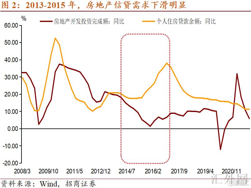 从结构来说,房地产信贷需求降低是致使上一次信贷增速下跌的首要原因。历经了次贷危机后的迅激增长,房地产业在2013—2015年历经了去库存阶段,房地产开发投资明显降低,房地产开发投资完成额总计同比增速从22.8%下滑到1%。就在此时,个人住房贷款需求也显现了大幅震荡。受益于2012年的宽松政策,个人住房贷款增速在2012末—2013年阶段,快速上升并维持着20%以上的高上涨;但2014年的《政府工作数据》提议了“做好房地产税立法有关工作”,居民购房意向快速走弱,个人住房贷款增速最多回调7个百分点,并连续到2015年年中,商品房销售面积攒计同比增速也从50%跌向-16%。
