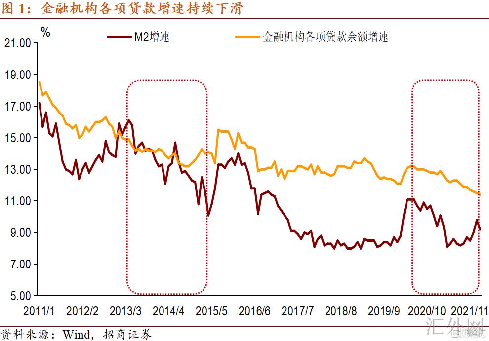2021年,中央银行运用多元滤波法预期了“十四五”期间我国潜在产出增速。据其预期,“十四五”期间我国潜在产出增速将维持在5.1%—5.7%之间,呈渐渐下跌趋势。从结构来说,固定资本投资的拉动效应将趋势性降低,劳活力投入的奉献连续为负,劳活力质量的拉动效应保持在0.5—0.6个百分点之间。基于此,中央银行预判“潜在产出上涨的周期性下滑会致使我国经济增速的下探,货币政策对实体经济支持强度与潜在产出增速大体匹配”,推测9%以上的M2增速即符合货币政策中介计划。受于去年12月迄今,M2增速已从9%的底部持稳回涨,社融增速也稳居10%上方,所以中央银行“稳信用”的阻力较为可控。