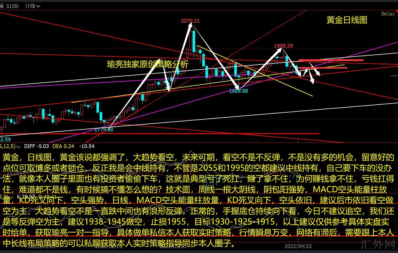 黄金,日K图,黄金该说都强调了,大趋势看跌,将来可期,看跌不是不回弹,不是没有多的可能,留心不错的点位可取博多或者锁仓,反正我是会中线持有,不管是2055和1995的空都推荐中线持有,自己要下车的没办法,就像本人圈子里面也有投资人偷偷下车,这就是典型亏了死扛,赚了拿不住,为何赚钱拿不住,亏钱扛得住,难道都不是钱,有时候搞不懂怎么想的?技术分析,周线一根大阴线,阴包阳强劲,MACD卖方能量柱放量,KD死叉朝下,卖方强劲,日K线,MACD卖方能量柱放量,KD死叉朝下,卖方依旧,推荐后市依旧看跌买跌为主,大趋势看跌不是一直跌中间也有浪形回弹,正常的,手握底仓连续朝下看,今日不提倡追空,我们依旧等回弹空为主,推荐1938-1945买跌,止损1955,计划1930-1925-1915,以上推荐仅供参考具体实盘实时给单,获取瑜亮一对一指导,具体做单私信本人获取实时策略,行情瞬息万变,网络有落后,需求跟上本人中长线布局策略的可以私聊获取本人实时策略指导同步本人圈子。