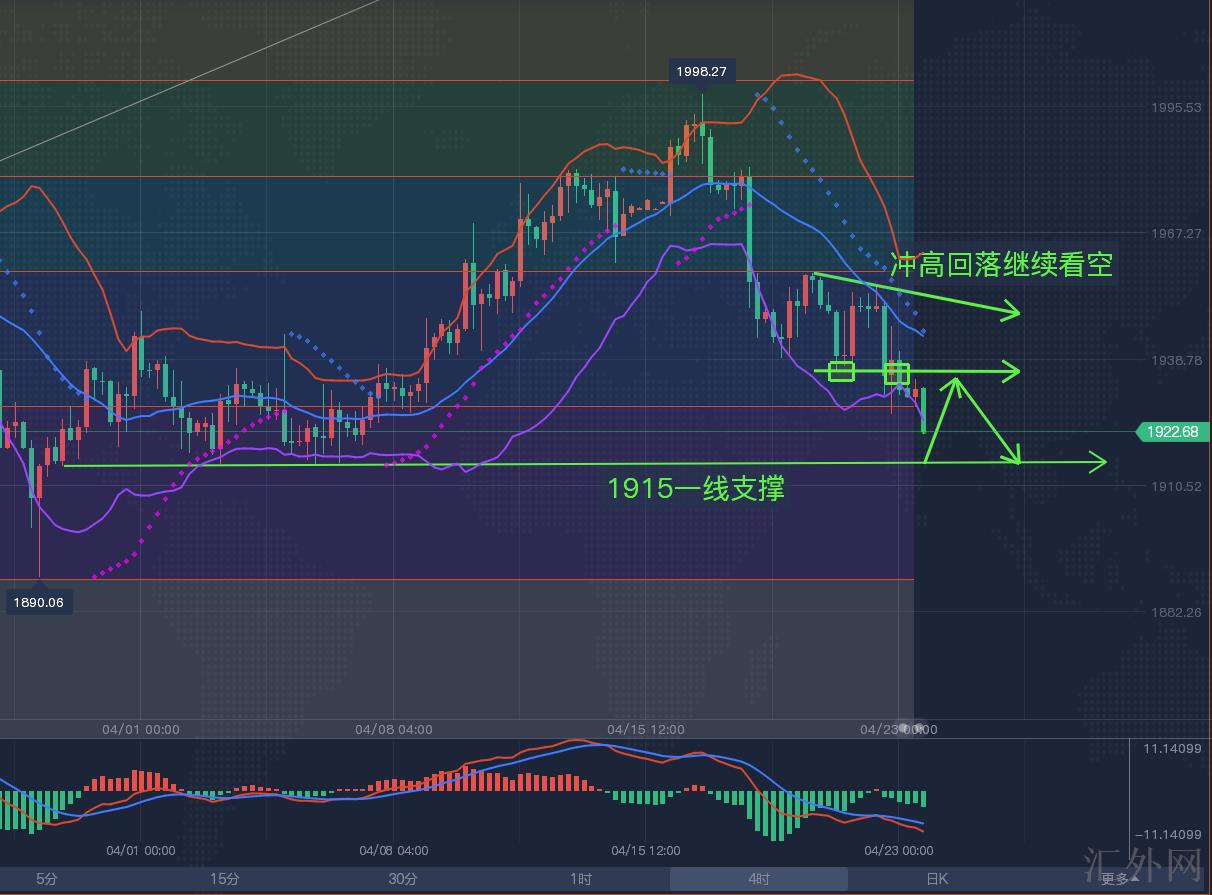 四时图中,黄金买方反击冲顶到1955,2次未击破压力1960,冲顶回调,中轨持续下探,反抽持续干空,前期的以下支撑点1936顺遂击破,看跌的信号显现,当前来说黄金已经迈出1940-1960的短时间调动,方向已经明朗,进场数钞票吃肉就行了,以下看1910-1915左右,仍有很大的下挫空间,不用疑虑太多!