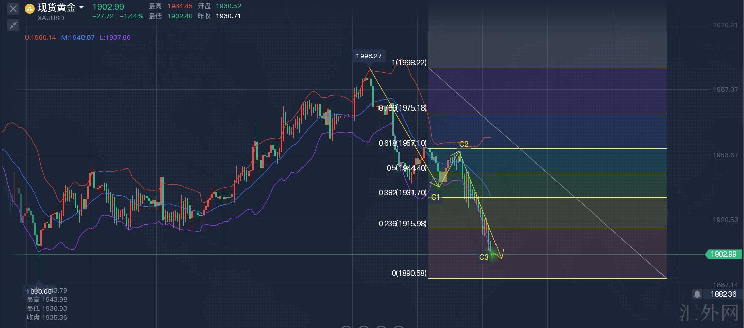 最近的黄金和我们的A股一样,均为不同程度的造成了较大程度的下挫,日K线级别任然处在卖方趋势中,日间也是在持续的保持下挫,日间最暴降幅高达20美金附近的区域,结构上当前处在C3浪的下挫中,尽管价格已经下挫至反向黄金分割23.6%的位置,但是来自买方的回弹任然显得苍白无力,而且C浪3下挫的内部结构并没有完善,所以维持逢高买跌的思路,夜里推荐等候价格回弹到1914-1915一线空单介入,博取C浪3又一次的下挫,风控点放置1920。计划位1890-1880,许多具体的交易参考在寻到鑫顺的方式中实时指导中给出!6点前给出大家的1918-1920手上也已经减仓!守稳高点空单