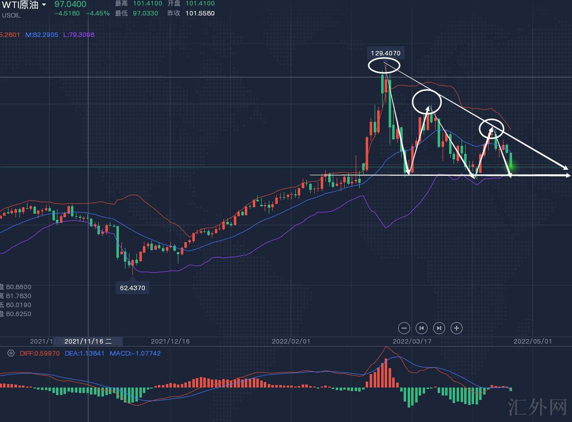 ①、原油如泄了气的皮球,开局则跳水下挫,但是真正的方向趋势不显著,只能算是偏空来对待,由于今日暴跌的原因是市场关注美联储加息困难,致使各大股市走跌,大家忧虑减缩经济下探对商品市场开始调动,原油价格必须顺应下挫,导致现在的提供端任然紧俏,所以卖方趋势不显著,后市在上冲100关键点位也不奇怪,所以笔者推荐大家不用着急追空,坐山观虎斗,方向清晰后一击毙命。