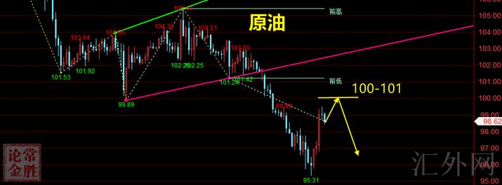 原油行情分析:昨天(4月25号礼拜一)原油开盘乏力,早盘朝下击穿100关键点位后欧盘惯性下挫,美盘刷新95.2线底部持续回弹,交易在99.3附近,收回了当日多部分失地。