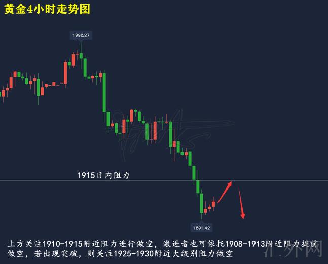 黄金技术分析来分析,日K线上,隔日黄金保持前两个交易日下跌趋势,又一次遇阻MA5日移动均线展开下探,盘中报得中阴,日K线上,今日行情适当回涨,但均线抑制较强,维持买跌即可;4小时上,隔日黄金走震荡下探行情持续走跌,并没有断刺破下缘创下低,目前布林带处在开口期,MA均线三线朝下,KDJ随机指标三线并拢往上,MACD指标绿色量能柱适当缩量,快慢线死叉朝下,综合来说,当前黄金持于隔日新低左右盘整,短时间均线仍处在抑制,日间推荐持续维持买跌,上方注意1910-1915左右压力,激进派也可依托1908-1913左右提早买跌,若行情显现大幅回涨,则再注意1925-1930日K线级别压力买跌。