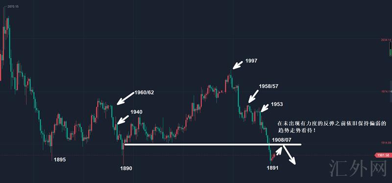 短线四小时图昨日弱势连阴下探,日间短线回弹空间略小,属于一步到位的弱势下挫手法。今日布局上多空保持性需求从新判定,一是昨日的极弱下挫表现今天是否保持,若能连续放量下探,顺势看跌即可;反之若亚欧盘一直企稳在1890上方运行,则短线不消除回弹对昨日的下挫空间执行修正。多空转换之间多留心形态的转换灵活应付。