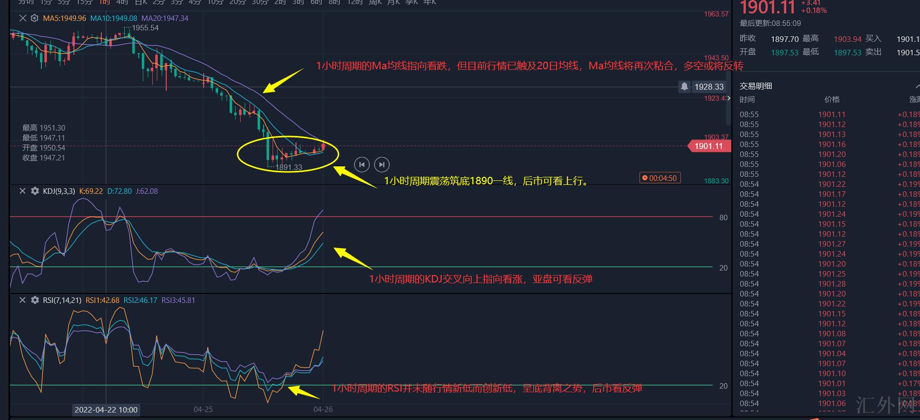 当前1小时周期震荡筑底1890一线,局部仍未见显著信号,推荐早盘依托1900买涨。