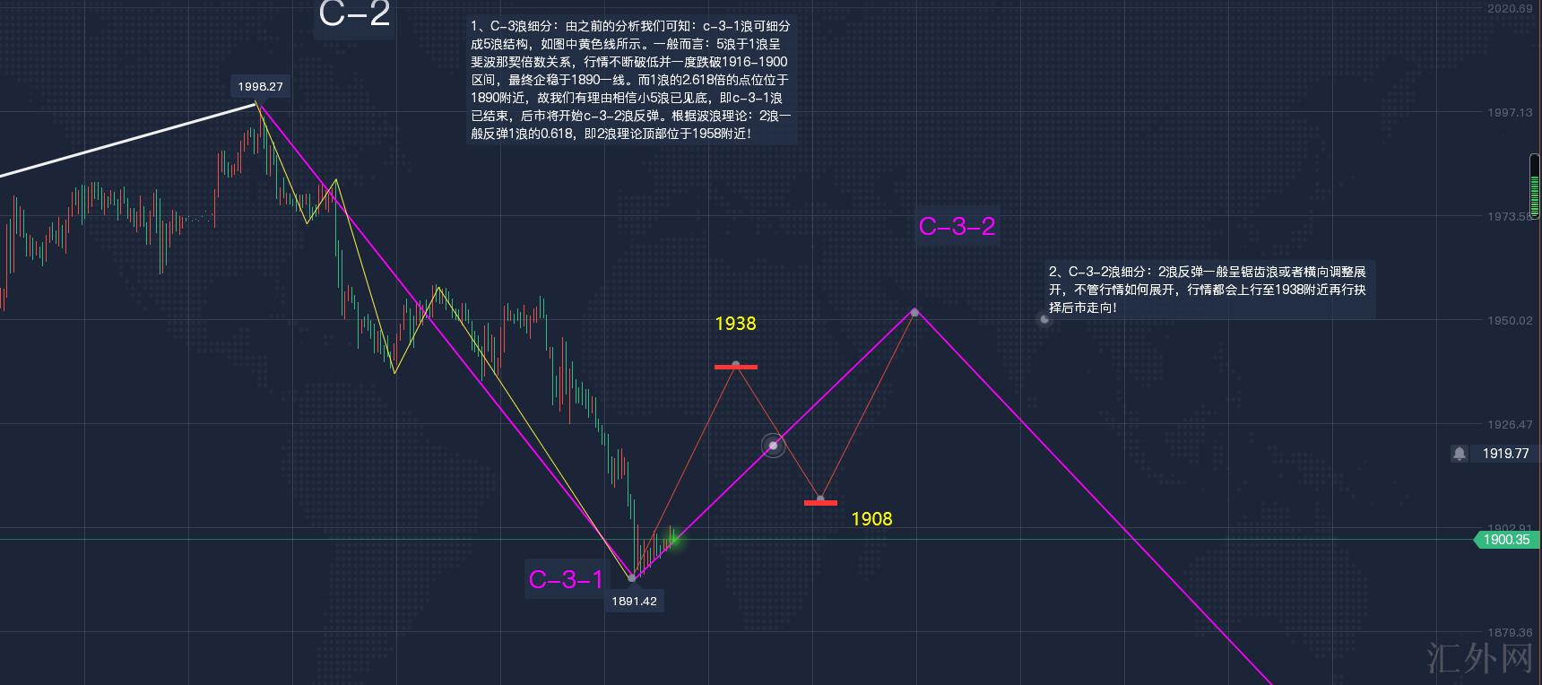 1、C-3浪细分:由以前的分析我们可知:c-3-1浪可细分成5浪结构,如图中黄色线所示。一般来说:5浪于1浪呈斐波那契倍数关系,行情持续破低并最多跌穿1916-1900区间,最终持稳于1890一线。而1浪的2.618倍的点位位于1890左右,故我们有理由相信小5浪已到底,即c-3-1浪已终结,后市将开始c-3-2浪回弹。依据波浪理论:2浪一般回弹1浪的0.618,即2浪理论顶部位于1958左右!