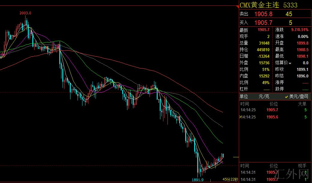 在避险浪潮打击世界市场期间,星期一美元指数连续刷新2020年3月迄今高位。金价最多跌超2%,创3月29号迄今新低到1890左右,在美联储官员作出一连串鹰派讲话后,市场预期美联储今年将大幅加息控制通货膨胀,同期多国政策策划者的鹰派评论也提升了世界中央银行乐观缩紧利率政策的风险,忧虑持有黄金的可能成本增长,这使黄金价格遇阻,亚洲冠状流行病令大宗商品遇阻,黄金价格也承受牵累,价格直接下探到1890一线。