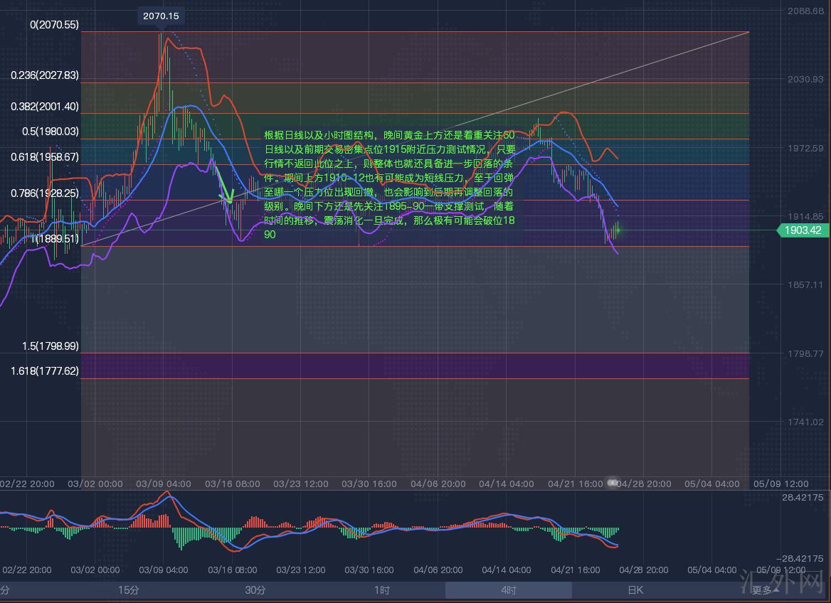 依据日K线以及小时图结构,夜里黄金上方依旧着重注意60日K线以及前期交易密集点位1915左右阻力试探情形,只要行情不返回此位之上,则整体也就还具备更深一步回调的条件。阶段上方1910-12也有机会形成短线阻力,至于回弹至哪一个阻力位显现回撤,还将影响到后期再调动回调的级别。夜里以下依旧先注意1895-90一带支撑试探,伴随时间的推动,震荡消化一旦完成,那么极有机会会突破1890,而从日K线结构来说,今日破一次1890,回撤1880-75也保持不可,但是当前也需求注意美元连续居高,随时或许有技术回修,进而给黄金导致回涨量能的风险。