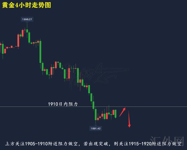 黄金技术分析来分析,日K线上,隔日黄金打破连阴下探,展开适当回涨,报得小阳,日K线上,今日行情持续下跌,预期短时间盘整恐会保持,日间有希望持续下探;4小时上,隔日黄金持于前一个交易日收盘价位持于盘整,展开适当上升,目前布林带处在开口期,MA均线在迈出双死叉后,MA5拐头向前,KDJ随机指标三线马上并拢朝下,MACD指标红色量能柱开始显现,快慢线金叉向前,综合来说,日间黄金即使回涨,但均线抑制依旧较强,日间推荐维持买跌,上方注意1905-1910一线压力,若行情显现击穿,则再注意1915-1920左右压力买跌。
