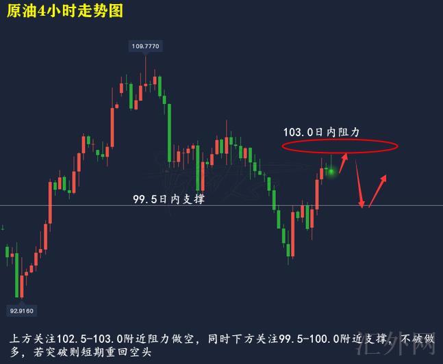 原油技术分析来分析,日K线上,隔日原油打破连阴下探,并展开回涨,但刷新MA10日移动均线位置后回调,报得带上下影线的中阳,日K线上,今日行情亚盘刷新MA10日移动均线遇阻,预期短时间仍有下探;4小时上,隔日原油呈震荡上涨行情,展开上升,并刺破中轨,今日早间又一次高峰后回调,当前报得倒挂阴,目前布林带处在开口期,MA均线迈出双金叉,KDJ随机指标三线朝下,到达超买,MACD指标红色量能柱连续放量,快慢线金叉往上,综合来说,原油当前短时间有下探,日间推荐依托102.5-103.0左右压力买跌,同期以下注意99.5-100.0一线支撑,不破也可买涨,若击穿,则短时间重返卖方。
