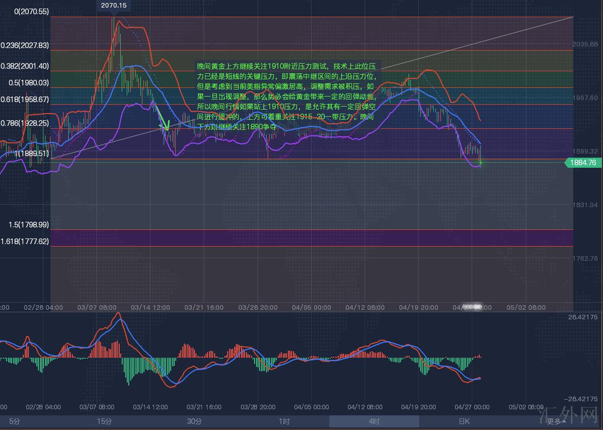 从日间黄金运行节奏来说,起整体尚且依旧处在预计的中继震荡形态中的,当前的行情与4月21号的运行状态有相似,即只要上方核心阻力尚且仍在,中继震荡形态结构不变,则后期行情就仍有更深一步回调调动的机会性。夜里黄金上方持续注意1910左右阻力试探,技术上此位阻力已经是短线的核心阻力,即震荡中继区间的上沿阻力位,但是顾虑到目前美指格外偏激居高,调动需求被积存,假使一旦显现调动,那么势必会给黄金导致适当的回弹量能,所以夜里行情假使立稳1910阻力,是允许其有一定回弹空间执行缓冲的,上方可着重注意1915-20一带阻力。夜里以下则持续注意1890争夺,4月21号行情也有一次刺破区间下沿动作,但仍未组成有效跌穿,所以可以参考上一次运行节奏,今夜或明天或许会显现再次回弹高位,一旦高位证实,技术上依旧更看好于再显现一次下挫调动,到时以下1890失守,或可期望1880-70,甚到1850左右支撑试探。但是任然需求注意的是,当前美指极端的运行状态给市场导致的无法预判的风险。