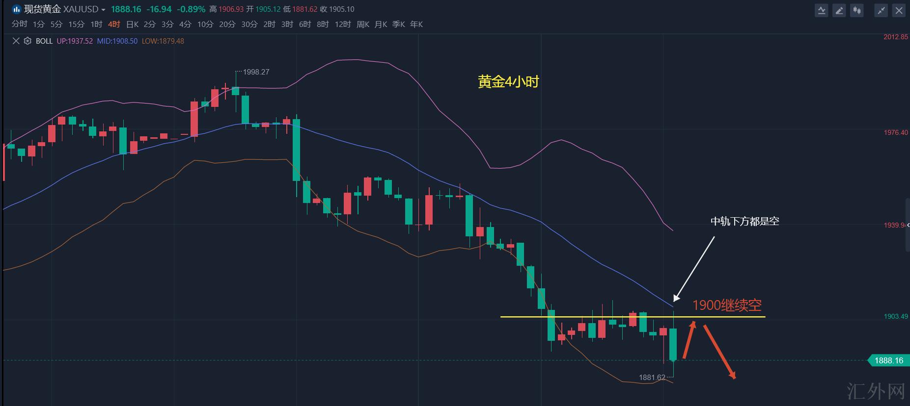 4小时图中,回弹触碰中轨持续下探,卖方趋势已成定局,任何的回弹均为给进场空的好机会,跟上节奏,盈利就变的简单,美盘行情大,顺势吃肉,俄乌当前正在协商,回撤是必然,上方防守可以设在1910左右,MACD柱4小时图中处在0轴以下,均线全部朝下发散,美元再次创下逾两年高峰,卖方趋势量能很足,以下计划看1850,这周内到达,拿好手中的空单,耐心等候利润增大!