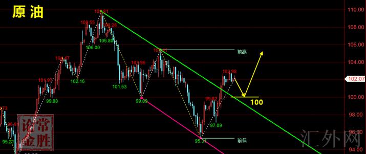 4小时级别:震荡下挫后回弹;MACD金叉,KDJ金叉,原油价格顶破了布林线中轨压力,在失守布林线中轨101.10前,短线倾向更深一步试探布林线上缘105.70左右压力,是否更深一步往上击穿,依旧待观察。后市更深一步行情,留心布林线轨道96.50-105.70区域击穿情形。