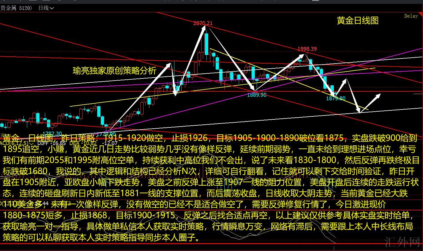 黄金,日K图,昨日策略:1915-1920买跌,止损1926,计划1905-1900-1890突破看1875,实盘跌穿900给到1895追空,小赚,黄金近几日行情比较弱势差不多没有像样回弹,保持前期弱势,一直未给到理想进场点位,好在我们有前期2055和1995附高点空单,连续获利中高点我们不会出,说了将来看1830-1800,随后回弹再跌终极计划跌穿1680,我说的,其中逻辑和结构已经分析N次,细节可自行翻看,记住就可以剩下交给时间验证,昨日开盘在1905左右,亚欧盘适当下挫行情,美盘以前回弹上升到1907一线的压力位置,美盘开盘后接连的走跌运行状态,接连的砸盘创下日间新低到1881一线的支持点置,而后震荡收盘,日K线收取大阴行情,目前黄金已经暴跌110美金多,未有一次像样回弹,没有买跌的已经不是适合买跌了,需求回弹修复行情了,今日激进现价1880-1875短多,止损1868,计划1900-1915,回弹后面找合适点再空,以上推荐仅供参考具体实盘实时给单,获取瑜亮一对一指导,具体做单私信本人获取实时策略,行情瞬息万变,网络有落后,需求跟上本人中长线布局策略的可以私聊获取本人实时策略指导同步本人圈子。