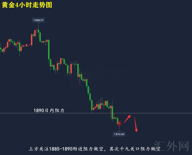 黄金技术分析来分析,日K线上,隔日黄金经历前一个交易日适当上升后又一次遇阻于MA5日移动均线展开下探,盘中刺破下缘报得中阴,日K线上,今日行情开盘持续下探,预期维持下挫;4小时上,隔日黄金持续走跌,遇阻于中轨MA20日移动均线展开下探,目前布林带马上收口,MA均线三线朝下,KDJ随机指标三线向前,到达超卖,MACD指标绿色量能柱连续放量,快慢线死叉朝下,综合来说,黄金日间抑制较强,推荐持续维持买跌,上方注意1885-1890左右压力买跌,其次千九左右关键点位压力。