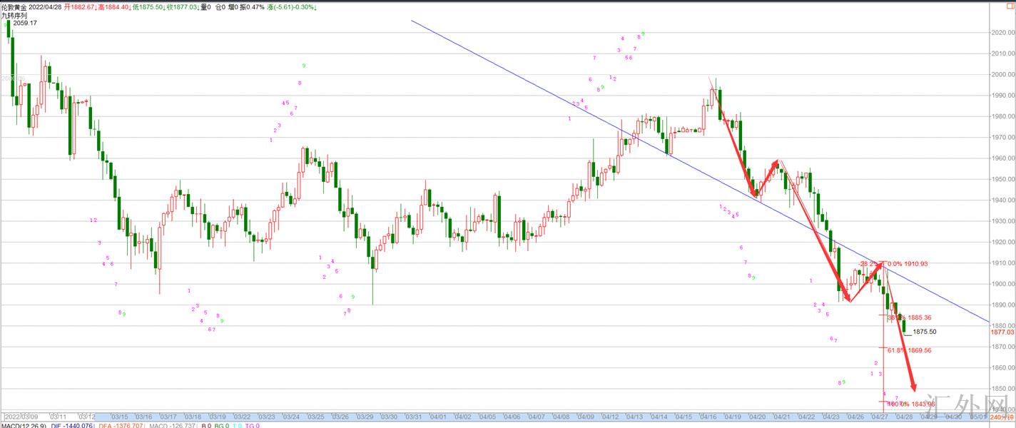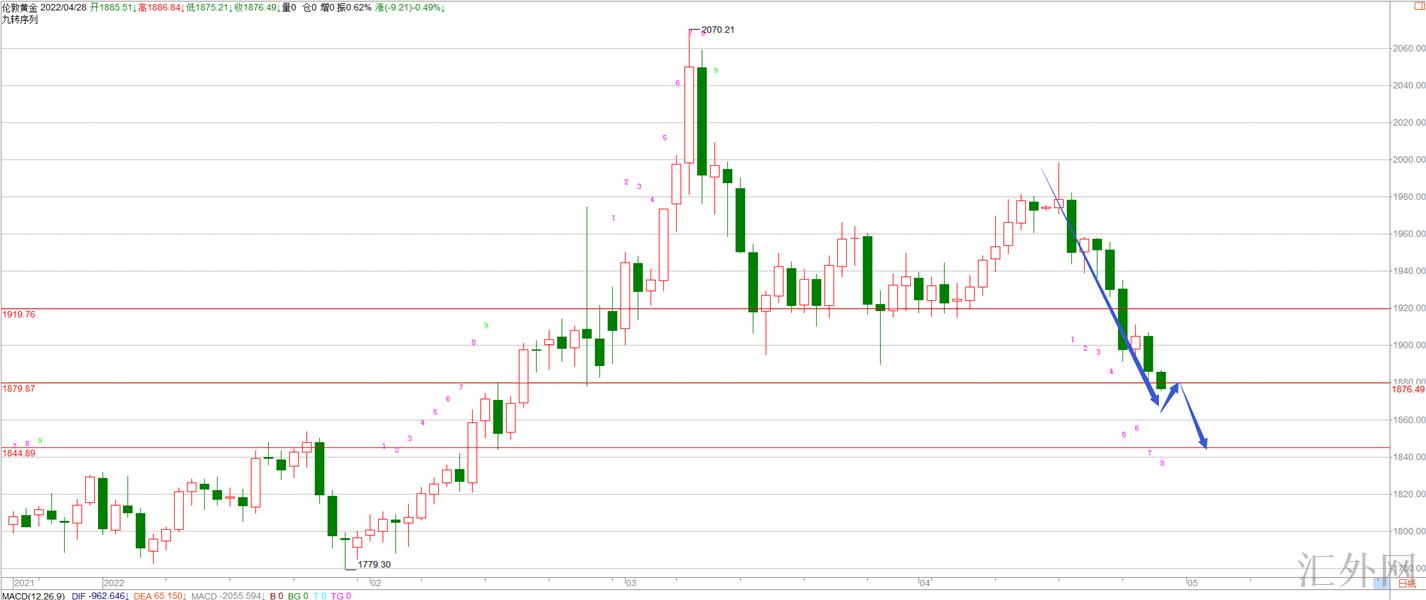 黄金下跌趋势依旧是在,依照日K图的一个态势来说的话,跌穿1880这里,下一个计划位置很有机会会去刷新1943-45这里。