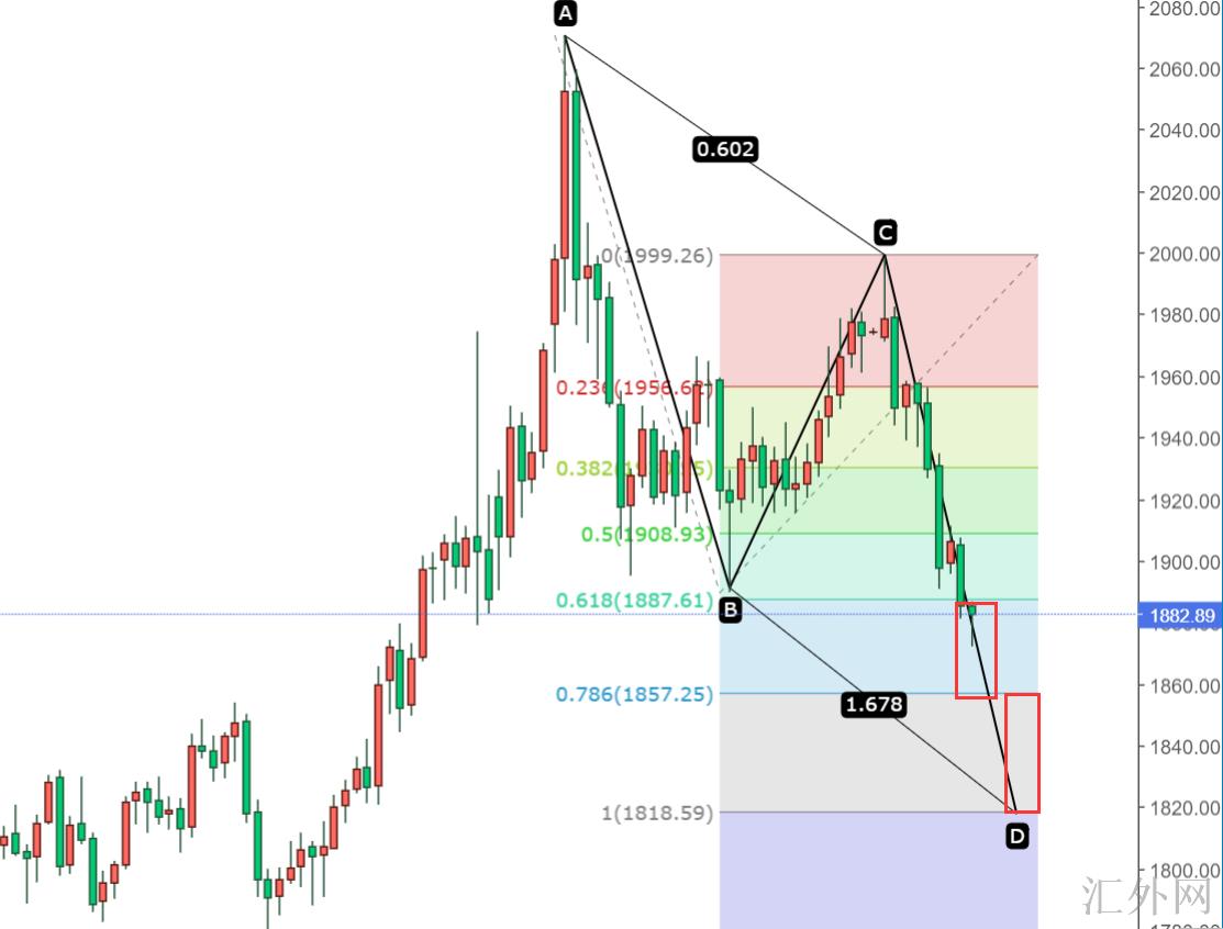 你们都知道我看1858,当下是不是认为越来越近了?以前你敢想吗?所以行情都得一步步砍,在它突破ABCD当中的B点后,整个大级别的对等三角形就已经成立了,末端在1820左右没错,可当下黄金需求得到58,随后才可结合0.618%比例1887的位置,酝酿出30美金的横盘期,再更深一步选择对1820执行考验。