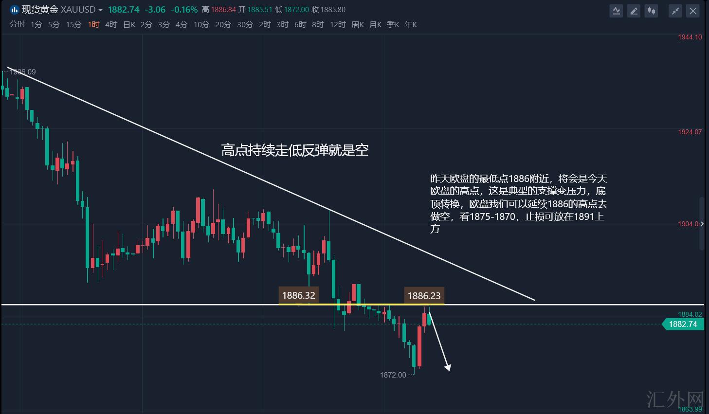 昨日欧盘时段黄金遇阻1900关口持续走跌,而且跌穿1890这个转折点,美盘瞬间跌向1881低点,代表卖方阻力正在持续下探,马上面临新一次下跌趋势。就当前来说,尽管刷新1872低点回弹回涨强度也无力,但是也遇阻1886左右,所以今日1870一线是击穿核心,今日还要持续走跌的,可以当下1886-1891一线布局空看下探,以下注意1875-1870左右支撑,顺势看跌即可,不用过多担忧深V反转。黄金操作上道氏论金推荐以回弹买跌为主,回踩买涨为辅,上方短时间注意1886-1891一线压力,以下注意1870-1865一线支撑。