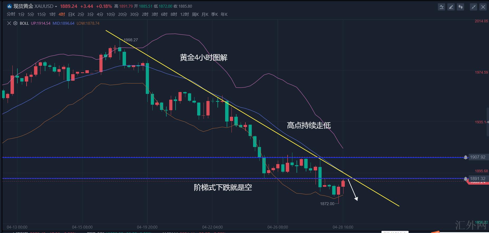 从黄金4小时图中来说,反抽前期低位1890,迅速回撤,黄金仍有波下挫趋势,诚然本轮若不能创新低,可以反手试图多单,永远不做死买方和死卖方,不和市场对着干,唯有顺应市场趋势,分析转折点显现,准确进场,才可永远立于不败之地,黄金底部首要是周K图中轨支撑,这个位置若2次下探都未破,证实支撑有效,则进多,跌穿则是瀑布1850的节奏,道氏论金预期会在这个区域调动一波时间,高抛低吸是最佳的战法!