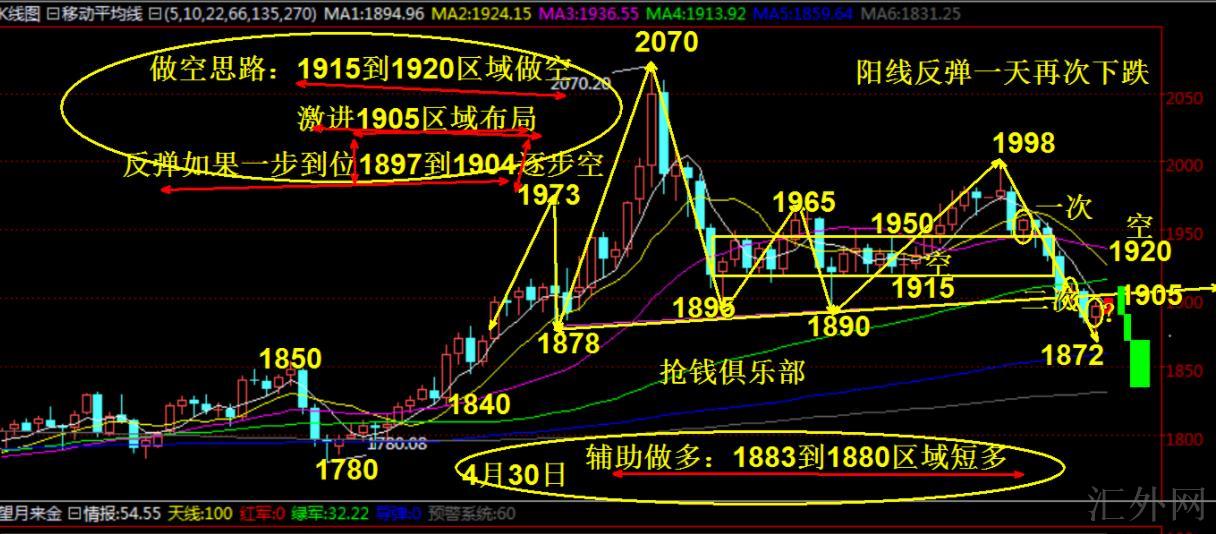 首先加息没有落地即便市场预计提早炒作,但是美联储议息后发言才是核心,这个决定6到7月的加息缩表预计。这个时候有好处空头悬挂头上,谁也不会发起买方趋势,所以技术分析基本分析看均为一个技术回弹,无非我们昨天不期望你追空,诚然技术回弹30美金也是不错利润,也可以适当参与,但是最近不适合追多了,支撑任然依旧1877到1882区域。