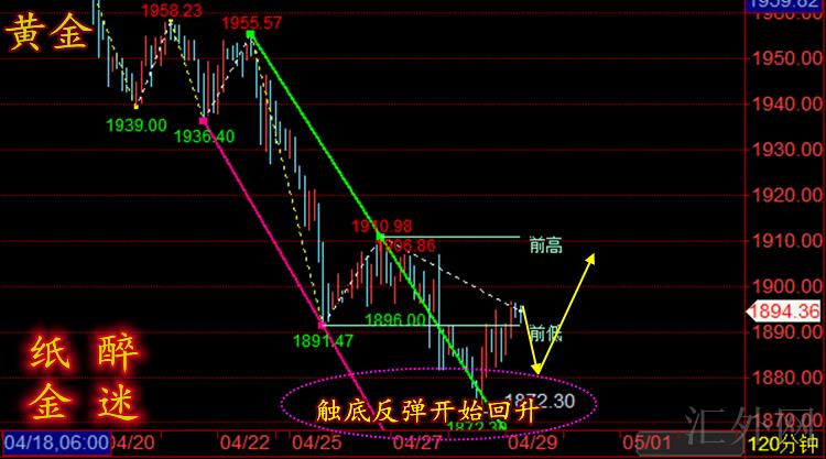 黄金技术分析分析;黄金昨日新低中阴线收低,日K线经历小阳星K线回弹修正后面,隔日完成蓄势突破且收在低点,跌穿了1890核心的支持争夺点,且日K线收在支撑点之下,日K线中继性调动空间打开。也是浪形调动破低保持,展开C浪下探。昨日盘中伴伴随反复拉锯,下探后反抽1906二次遇阻,再收盘破低收低,隔日看保持下探,弱势行情早盘就会有所表现。
