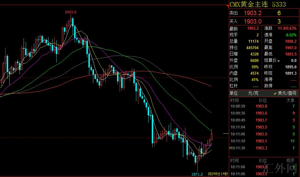 黄金星期四止跌回弹,盘中最低跌向1872美元每盎司,欧盘开始震荡上升,收盘上涨0.48%,报得1894.72美元每盎司;白银震荡下探,收盘下跌0.55%,报得23.16美元每盎司。