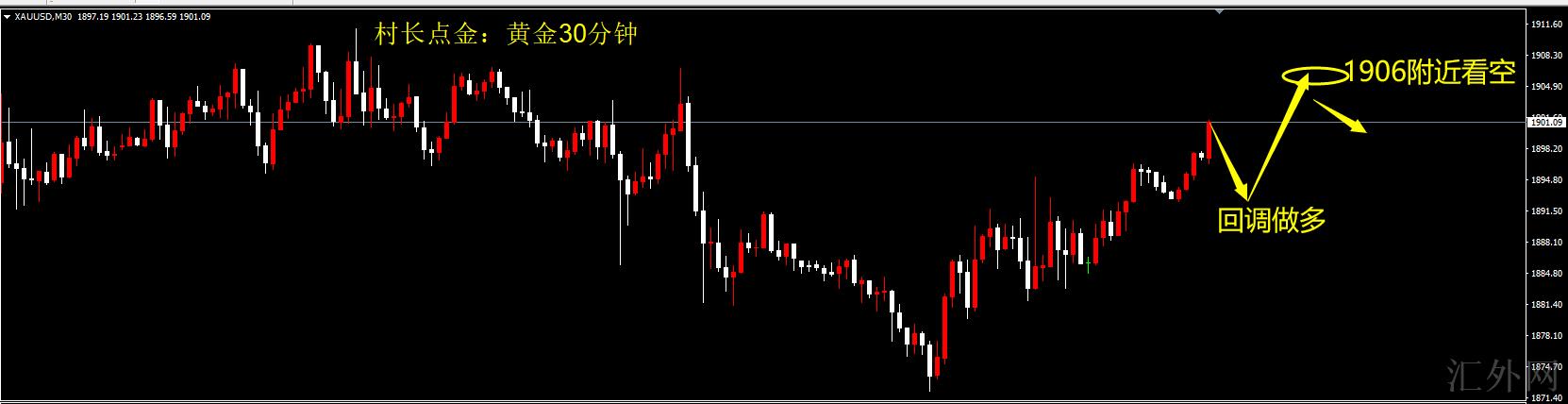 对于今日的黄金,从K线行情来说,我对于日间的看法是先涨再跌,先看行情回弹到1906左右,随后在1906左右回调,所以今日的策略是先回踩买涨,随后再回弹高空。