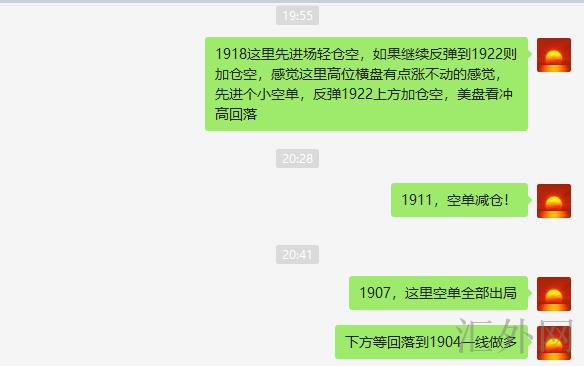 夜间黄金的行情,很显著黄金价格在高点1913-1917一线高点盘整了,这里感觉高点可空,最后黄金一个阳线拉到1919一线,也接近我预期的买跌点位1920一线,所以直接让大家进场买跌了,这里预备是1922加仓空的打算,但是黄金价格最终没有击穿1920,冲顶回调1907,空单全部出局。