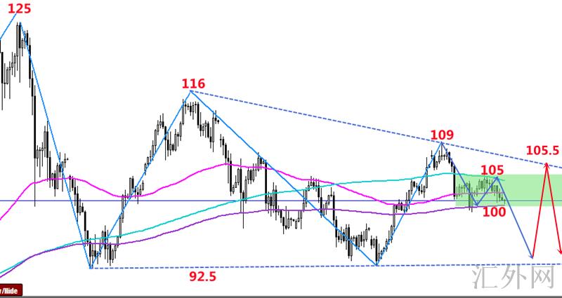 原油受地缘局势和提供层面影响,曾最多攀升125美元左右,为2008年末以来最高。随后冲顶回调多次试探93低点支撑都未能有效跌穿,加上对俄的制裁或许会产生有史以来最严重的石油提供打击之一,而且不或许取代这些产能,并示意将不再增产。原油最近上蹿下跳,没有清晰的行情方向,任然处在三角形整理形态中震荡,其行情和李鸿彬预计依旧完全相符。当前116—109下探趋势维持完好,日K线回弹高位在持续下探,表明高点阻力也显著,今日105.5左右可空,此位会是下探趋势抑制点,也是最近阻力位,可在此布局空看回调;以下注意100关键点位和98防守位置。