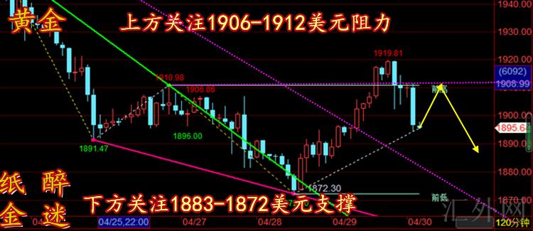 周线级别收录一根大阴线,持续保持看空趋势中,日K线级别上长上影线,更深一步显示1920一线压力位很强,不能上去将保持下挫几率,在四小时级别向上瞧,黄金在刷新1920以下遭遇阻力,下挫显现了两段结构,第一波给到1902一线完结,随后回弹在1914一线开始第二段下挫最低位给到1894水平,卖方量能总体较强,下星期一开盘关注黄金价格卖方保持,假使朝下击穿1894,下一个计划在1883美元,回弹的压力位注意1904-1906美元。综上所述纸醉金迷归纳黄金又一次冲顶遭遇阻力,收盘卖方量能较强,下星期一开盘斟酌回弹买跌为主。